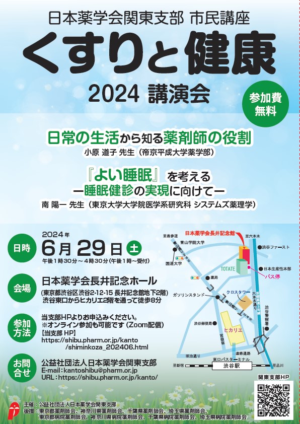 2024年6月29日(土)、日本薬学会関東支部 市民講座「くすりと健康2024」を東京・渋谷の日本薬学会長井記念館 長井記念ホールにて開催し、下記の2名の先生にご講演をいただきました。今年は対面形式での開催とオンラインによる配信のハイブリッド開催を試み、60名近くの方にご参加いただきました。