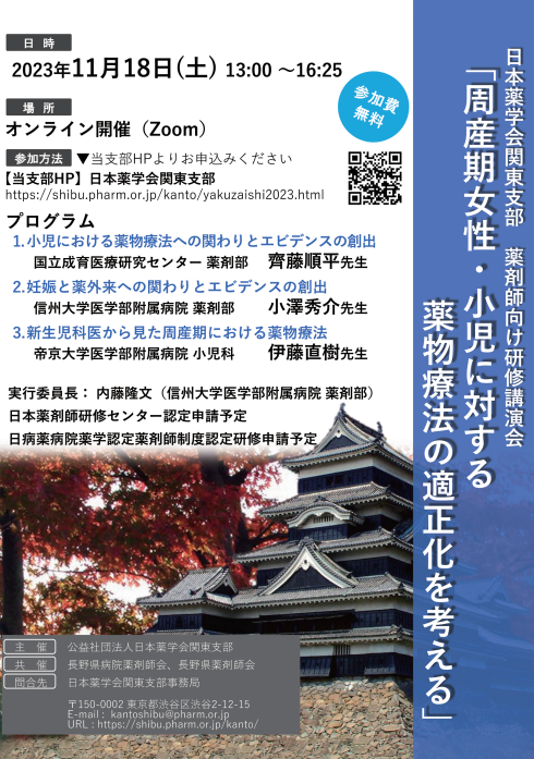 日本薬学会関東支部では、病院・薬局薬剤師のスキルアップへの貢献を目的として、「薬剤師向け研修講演会」を開催しております。第11回目となる本年度は、「周産期女性・小児に対する薬物療法の適正化を考える」をテーマとして、長野県で開催する予定でおります。現在、薬物治療に関わる薬剤師の方々に、周産期女性・小児に対する薬物療法の適正化について理解を深めていただくためのプログラムとして、周産期女性・小児の領域で活躍する薬剤師および医師による講演を企画いたしました。